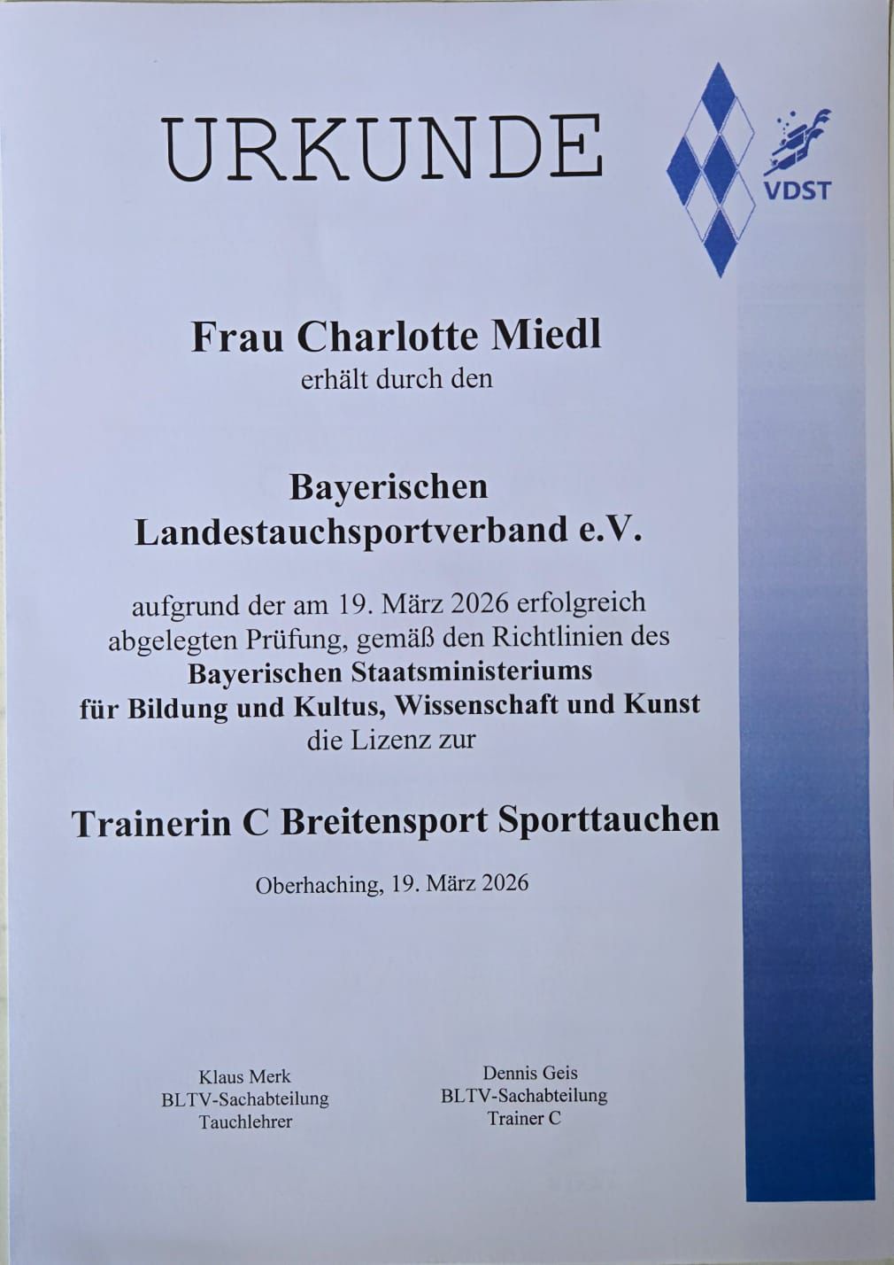 Die Ausbildung umfasste mehrere Lehrgangswochenenden in Bamberg sowie eine intensive Prüfungswoche an der Sportschule Oberhaching.